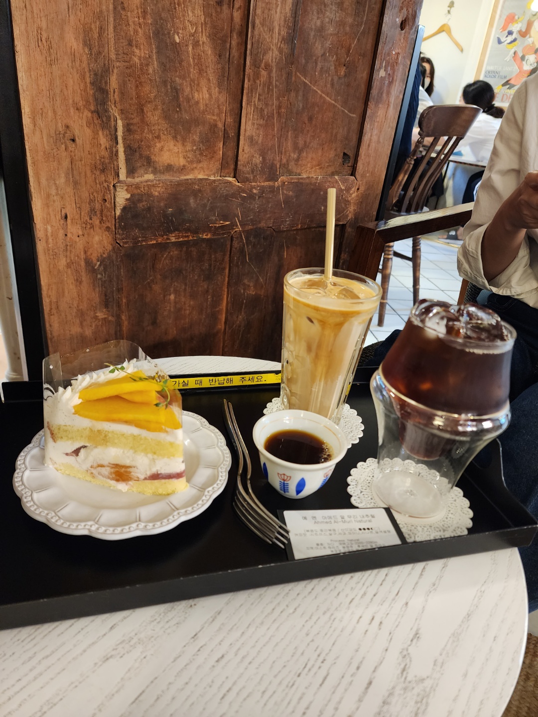 그런데 추가로 주문한 복숭아 케이크가 ㅎㅎ 부드러운 복숭아라고 생각했는데, 천도복숭아? 같은 좀 딱딱한? 딱봉ㅋㅋ 같아서 당황?ㅎㅎ 했다. 케이크 속 복숭아는 부드러울 거라는 편견을 깨 주었다.ㅋ 암튼 맛은 괜찮았다.