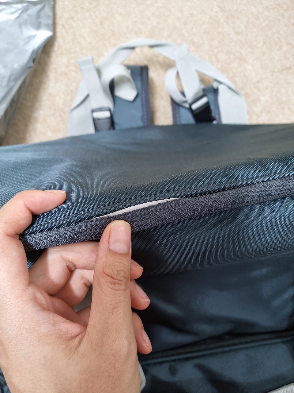 사진을 보면 알겠지만 마감 바느질이 중간에 겉감을 빼고 바느질되어 있다. 중고도 아니고 배민사이트에서 주고 산 건데 그냥 쓸 수는 없어서 고객센터에 문의했다. 하필 받은 날이 금요일인데... 맞교환한다고 해도 한글날이 껴서 다음 주 금요일에나 받을 수 있을 것 같다. 배송이 느린 편이 것 같았으니.....ㅜㅜ