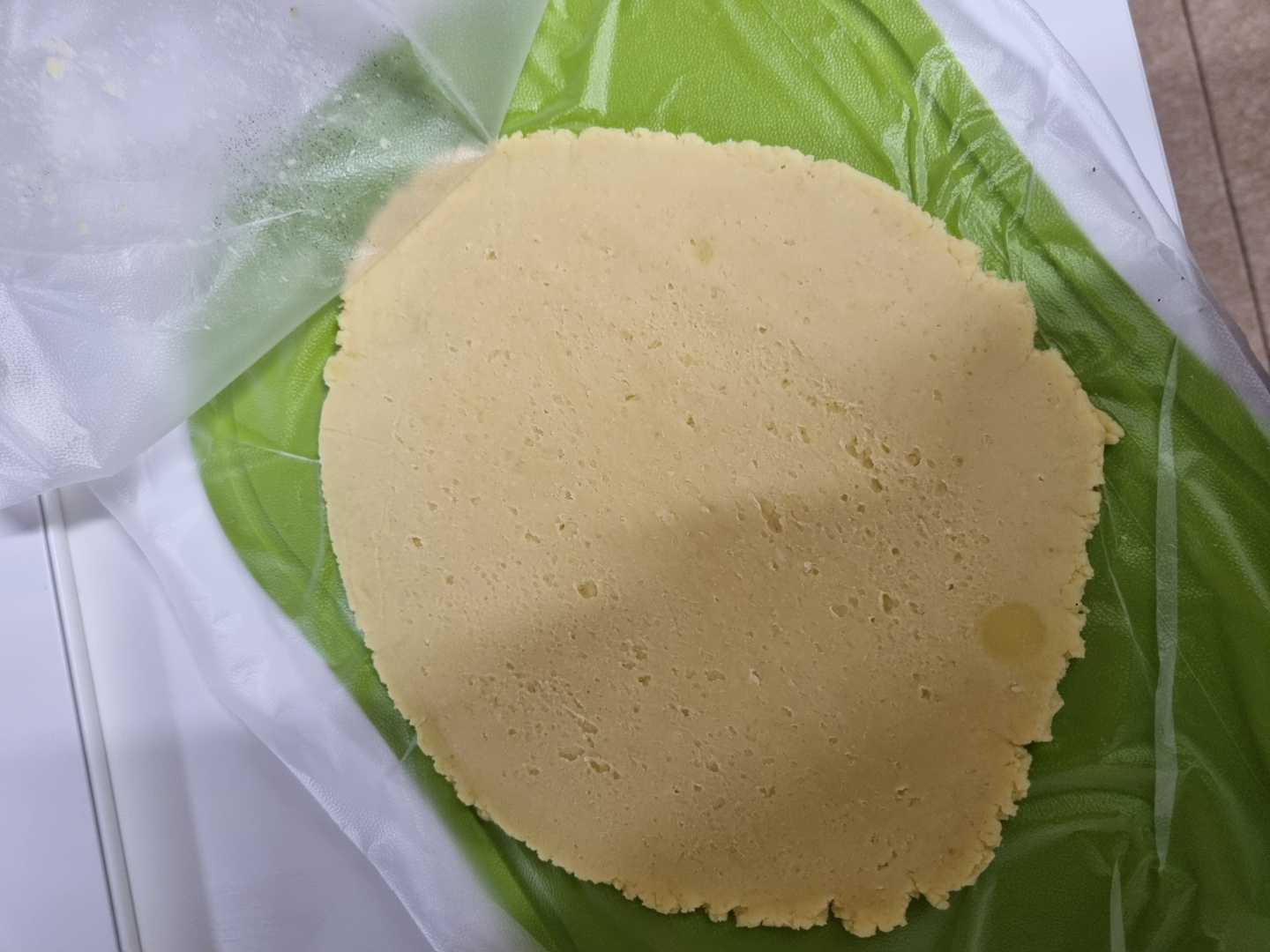 냉장고에서 꺼내니 반죽이 단단해져 있었다. 일부만 칼로 잘라서 테스트 삼아 에어프라이어에 구웠다.